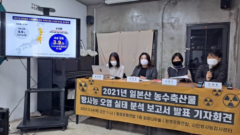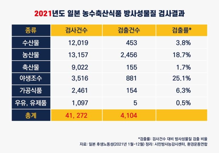 시민방사능감시센터와 환경운동연합은 24일 2021년의 후생노동성 식품에서의 방사성 물질 검사 결과를 분석한 '일본산 농수축산물 방사능 오염 실태 분석 보고서'를 발표했다.