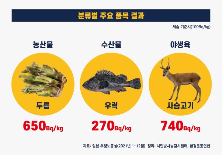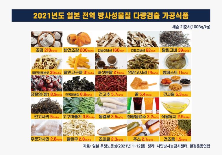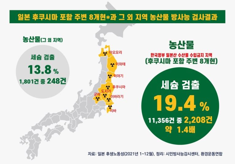 후쿠시마 원전 사고 이후 11년이 지나고 있지만 일본산 농수축산식품의 방사능오염은 지속되고 있다. 일본 후생노동성이 2021년에 실시한 일본 내 식품 방사능 검사를 분석한 결과 방사성물질 세슘이 농수축산식품의 다양한 품목에서 방사성 물질 오염과 그 피해는 여전히 지속되고 있다는 분석 결과가 나왔다.