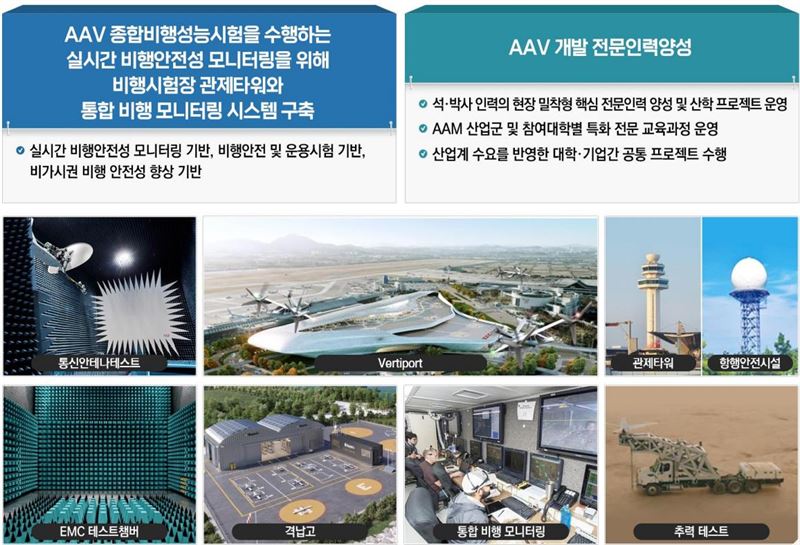 AAV 핵심기술 확보를 위한 기반 구축도 동시에 추진한다. 실시간 비행 안전성 모니터링을 위해 비행시험장 관제센터와 통합 비행 모니터링 시스템도 마련하고, 석·박사급 AAV 개발 전문인력 양성을 비롯해 대학·기업간 공통 프로젝트 수행도 지원한다