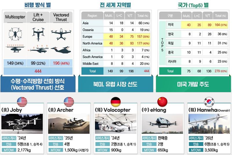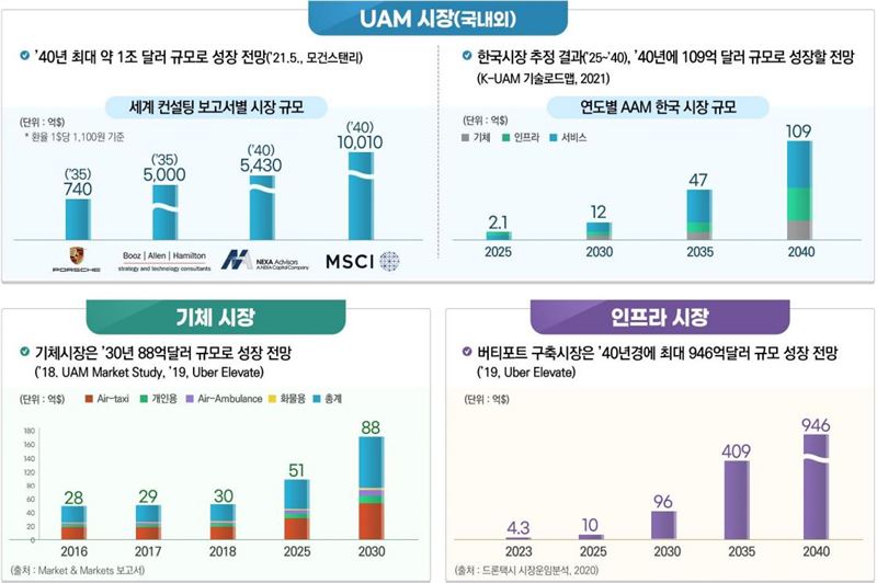 산업부에 따르면 2018년부터 세계적으로 AAV 개발업체가 급증해 현재는 200개 이상의 회사가 개발 중이다. UAM 시장은 2040년에는 최대 약 1조 달러 규모로 성장 전망되며, 한국시장은 2040년에 109억 달러 규모로 성장할 전망이 예상된다.