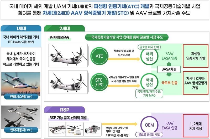 먼저 국내 기업이 해외에서 개발하는 1세대 기체의 파생형 인증기체 개발과 국제공동기술개발 사업 참여를 통해 차세대(2세대) AAV 형식증명기(STC) 개발과 글로벌 가치사슬을 주도한다는 전략이다.