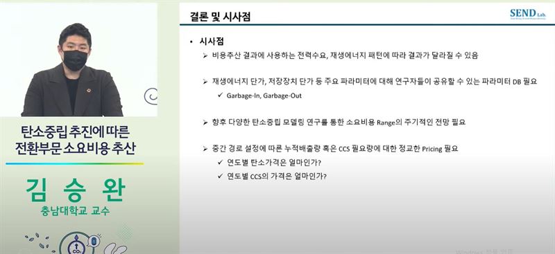 첫 번째 주제발표에 나선 충남대학교 김승완 교수는 '탄소중립 추진에 따른 전환부문 소요비용 추산'이라는 주제로, 정부 계획을 반영해 전력부문에서 필요한 소요 비용을 시뮬레이션을 통해 추정한 결과를 소개했다.