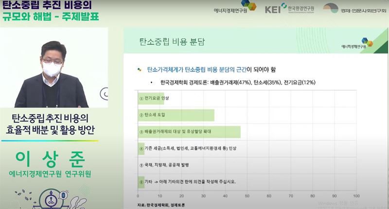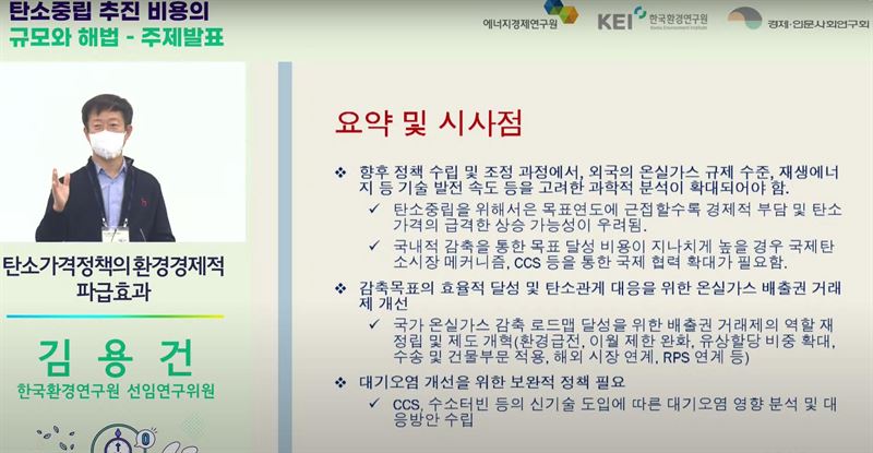 마지막 발제자로 나선 에너지경제연구원 이상준 연구위원의 '탄소중립 추진 비용의 효율적 배분 및 활용 방안' 발표에서는 경제 전반에 탄소배출권거래제를 고려한 탄소세 도입이 필요하며, 마련된 재원은 저탄소 전환에 우선 투입하고 저소득층 지원에 활용하는 것을 제안했다.