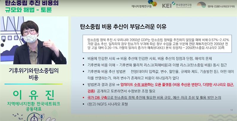 이유진 에너지전환 전국네트워크 공동대표는 과거 기후변화로 인한 피해 비용에 주목하며 “그간 비용을 추산하고 공유하는데 우리 사회가 지나치게 민감했다”며 “기후변화 비용에 대한 이해를 높이고 공유하는 것이 중요하다”고 언급했다.