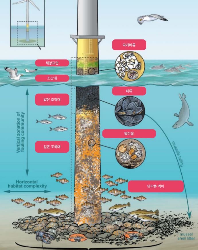 해상풍력의 하부구조물은 인공어초 역할을 하여 해양생태계를 풍부하게 하고, 일부 어업활동에 의한 생태계 교란을 막는 긍정적인 효과도 있습니다.