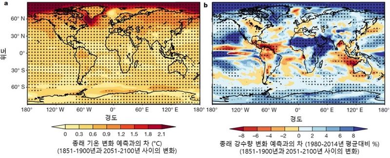 중간 정도의 온실가스 배출 시나리오(SSP-RCP 245) 에 있어서, 67개의 기후모델이 19세기 후반부터 21세기 후반에 강수량이 1.9-6.2% 증가한다고 예측했으나 각 기후모델의 온실가스에 대한 기후 응답 신뢰성을 고려함으로써 강수량증가의 예측 폭의 상한(6.2%)을 5.2-5.7%까지 감소시킬 수 있었으며 예측의 분산 또한 8-30% 줄이는 것이 가능했다.