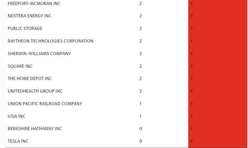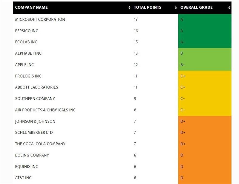 Net Zero 스코어카드 결과의 요약은 3개 회사만 전체 "A" 등급을 받았다. 평가된 55개 회사 중 Microsoft와 PepsiCo 2개 회사가 전체 성과에 대해 "A" 등급을 받았다. Ecolab은 "A-"를 받았다. 구글 Alphabet은 전체 등급 "B", Apple은 "B-", Prologis 및 Abbott Laboratories는 "C+" 등급, Southern Company 및 Air Products & Chemicals는 "C-" 등급, 평가된 나머지 회사는 "D" 또는 "F" 등급을 받았다. 전기차 그룹인 Tesla는 최하위를 기록했다.
