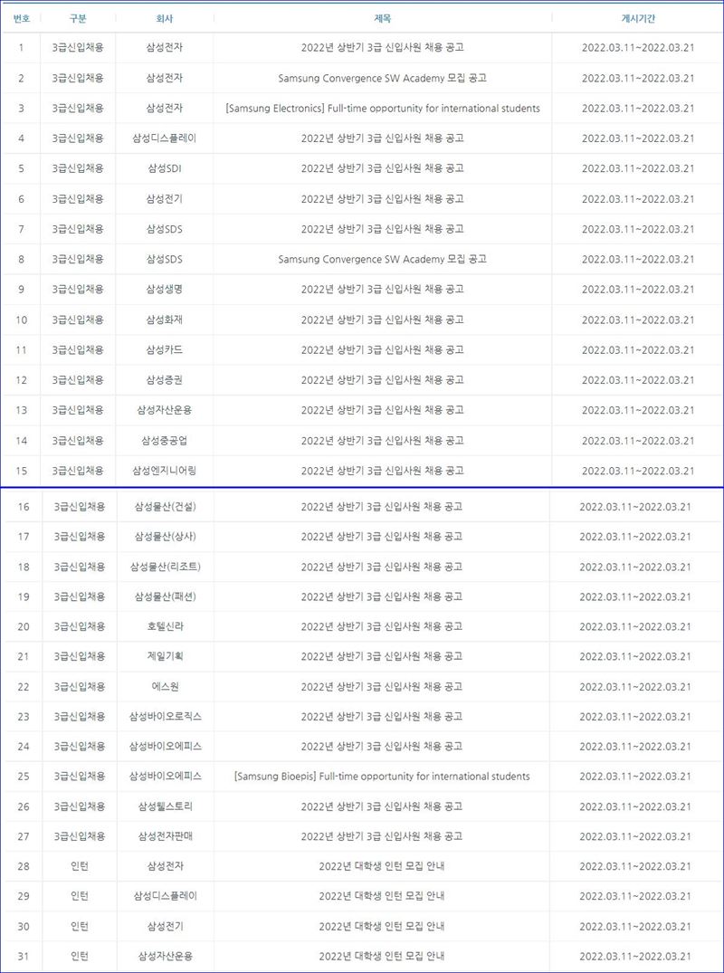 삼성전자, 삼성물산 등 18개 삼성 관계사가 2022년 상반기 공개채용을 시작한다고 13일 밝혔다.