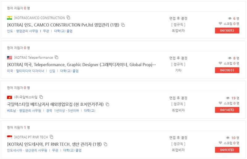 아랍에미리트, 인도, 캄보디아, 세네갈, 미국등에서 근무 할 수 있는 국내법인 및 현지법인들이 신입 및 경력사원을 모집한다. 해외취업은 영어는 필수 이며 의사소통이 가능해야 된다.