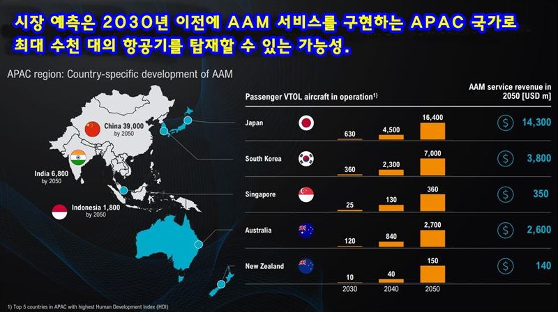 아시아 지역만 서비스 매출은 전세계의 40%인 369억달러(약 45조원)에 이를 것으로 전망됐다. 이 지역 국가들은 2030년까지 1,000대 이상의 eVTOL 항공기를 보유하며 그 이전에 AAM 서비스를 구현하게 된다.