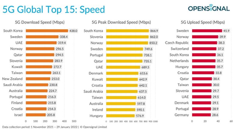 그렇다면 가장 빠른 5G 속도를 얻을 수 있는 휴대폰은 어디일까요? 평균 다운로드 속도가 438.0Mbps인 한국. 스웨덴이 338.4Mbps로 2위, UAE가 319.4Mbps, 노르웨이가 296.5Mbps, 카타르가 194.5Mbps로 뒤를 이었다.