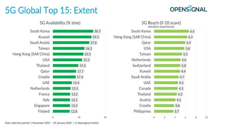 2021년 11월 1일부터 2022년 1월 29일까지 국가별 5G 가용성 범위.