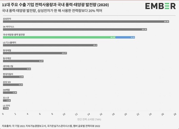 엠버의 이번 조사는 국내 풍력·태양광 발전량과 철강, 전자, 반도체 등 온실가스 배출이 가장 많은 상위 11개 기업의 전력 수요를 비교했다.
