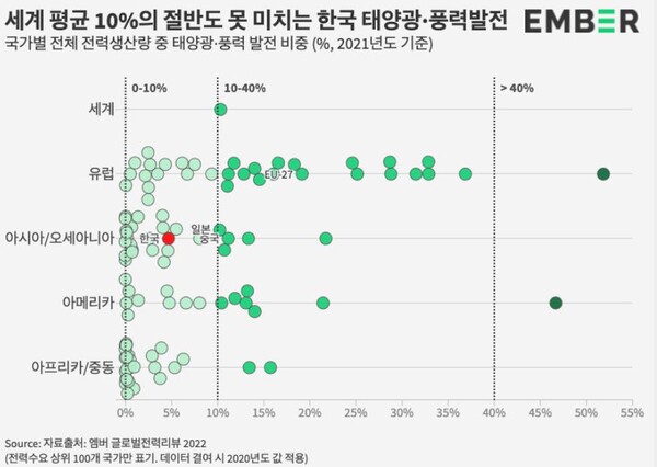 아시아 주변 국가인 일본, 중국, 몽골, 베트남을 비롯해 전 세계 풍력·태양광의 발전 비중이 처음으로 평균 10%를 넘어선 것에 비해 한국은 절반도 되지 않는 수치였다.