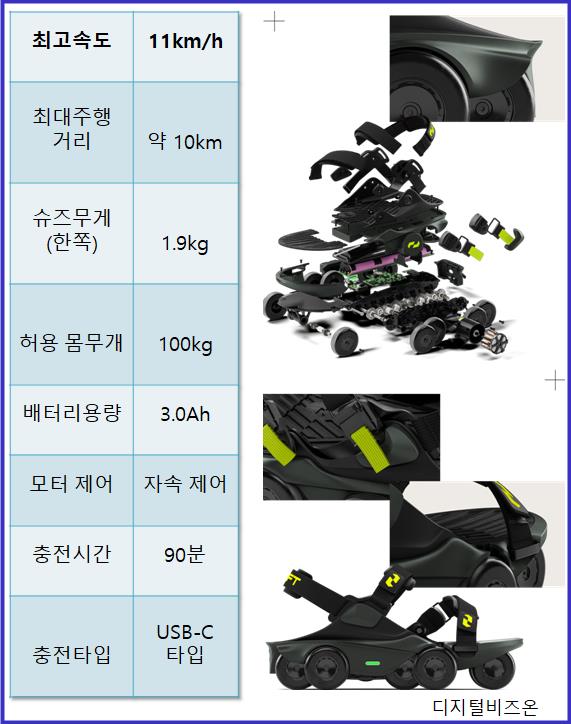 최고 속도는 시간당 11㎞, 충전에 걸리는 시간은 1시간 30분 정도이며 충전 시 약 10㎞를 걸을 수 있다. 신발 무게는 각각 1.9㎏이다.