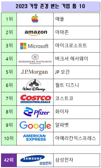 1일(현지 시각) 포춘(Fortune)이 발표한 2023년 '세계에서 가장 존경받는 기업' 순위를 발표했다.