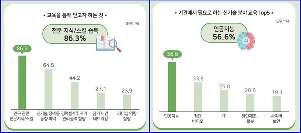 기관에서 필요로하는 신기술 분야 교육으로는 ‘인공지능’이 56.6%, ‘첨단 바이오’는 33.8%. ‘it’분야 25%, ‘첨단 로봇’은 20.6%, ‘사이버보안’은 19.1%를 차지했다.
