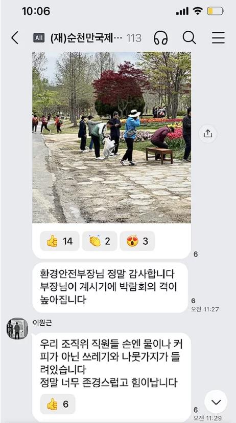 조직위 간부 직원들이 솔선수범해 미화 활동에 나서는 사진도 심심찮게 올라온다. 수시로 박람회장을 돌며 떨어진 쓰레기를 줍거나, 개장 시간보다 앞서 출근해 한 손에는 집게를, 한 손에는 쓰레기봉투를 들고 미화원들의 손길이 미처 닿지 않는 그린아일랜드 등 무료 권역을 살피는 이들은 조직위 팀장·부장급 직원들이다.