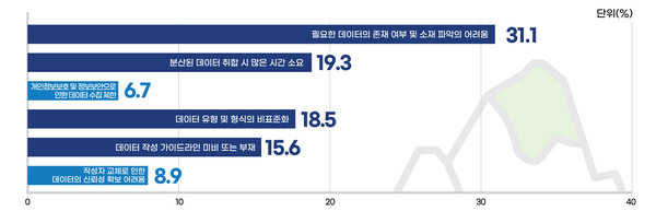 실제, 한국섬진흥원이 지방자치단체 섬 담당 공무원, 섬 전문가, 분야별 전문가 등 62명을 대상으로 ‘섬 통계 작성’ 관련 설문조사를 실시한 결과, ▲필요한 데이터의 존재 여부 및 소재 파악의 어려움(31.1%) ▲분산된 데이터 취합 시 많은 시간 소요(19.3%) ▲데이터 유형 및 형식의 비표준화(18.5%) 등 어려움이 큰 것으로 나타났다.