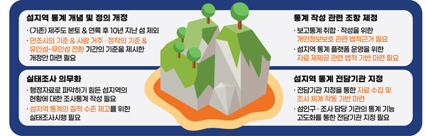 「섬 발전 촉진법」에 섬지역 통계 개념 및 정의와 통계 작성 관련 조항을 포함하고, 실태조사 의무화로 행정자료만으로 파악하기 힘든 부분을 보완했다.