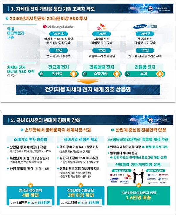 정부는 차세대 전지 개발을 위한 대규모 R&D를 추진할 계획으로, 전고체 전지(안전성↑), 리튬메탈 전지(주행거리↑), 리튬황 전지(무게↓) 등 유망 이차전지가 포함될 예정이다. 이를 통해 기업과 정부는 세계 최초로 차량용 전고체 전지 양산기술을 확보한다는 전략이다.