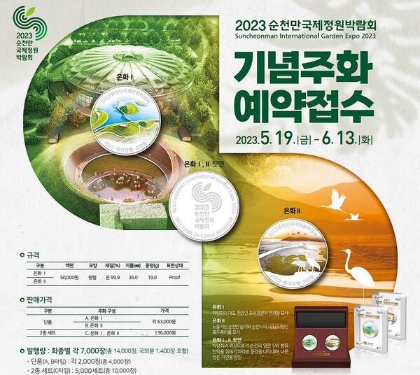 [디지털비즈온 이은광 기자] 한국은행이 2023순천만국제정원박람회의 국제적 홍보를 위해 박람회 기념주화를 발행한다. 발행화종은 은화 5만 원화로 2본이며 화종별로 7천장씩, 총 1만 4천 장이 발행된다.