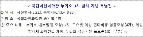 [디지털비즈온 이호 기자] 국립과천과학관(관장 한형주)은 국내 독자기술로 개발한 우주 발사체‘누리호’3차 발사 성공을 기원하기 위해 특별전을 개최한다고 밝혔다.