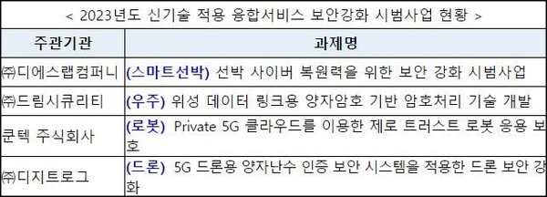 올해 시범사업은 (스마트선박) 스마트선박 보안위협 대응을 위한 인공지능(AI) 기반 사이버위협 탐지‧자동분석 시스템 개발 지원, (우주) 위성 데이터 송수신 시스템에 대한 양자암호화 지원, (로봇) 5세대(5G) 클라우드 기반 로봇시스템 암호 키 적용, 사용자 접근제어 보안 솔루션 개발 지원, (드론) 드론 운용 및 영상 정보 보호에 양자난수 기반 암호모듈 인증 지원 등을 통해 안전한 미래 융합 제품・서비스 개발을 지원한다.