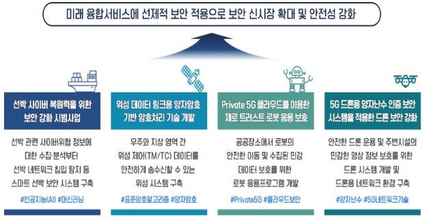 과기정통부는 미래 신산업 분야의 지속적인 디지털 대전환을 지원하기 위해 스마트선박, 우주, 로봇, 드론 분야 보안 강화 지원 과제(컨소시엄)를 최종 선정하고 총 34억 원 예산으로 보안내재화 및 사업화를 지원한다.