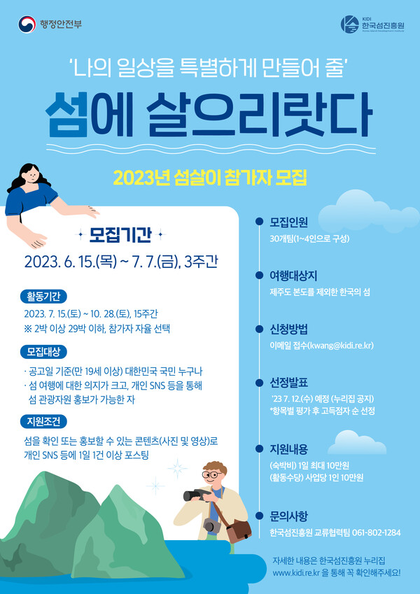 올해 섬살이 프로그램은 제주도 본도를 제외한 국내 모든 유인섬을 대상으로 한다. 오는 7월 15일부터 10월 28일 기간 중 섬 방문 예정인 30개팀(팀당 1~4인)을 선정해 활동비·숙박비 등 여행경비 등을 지원할 계획이다.