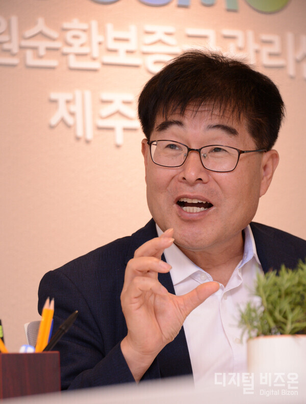 다양한 의견 청취와 정책반영을 위해 한 달 근무 중 반 이상을 제주도에서 반 제주도민으로 살고 있는 정복영 이사장, 그는 "욕심이 아니라, 세계적으로 한국형 탈플라스틱 제로화 자원순환보증금 제도를 해외수출 목표로 잡고 있다."고 밝혔다.