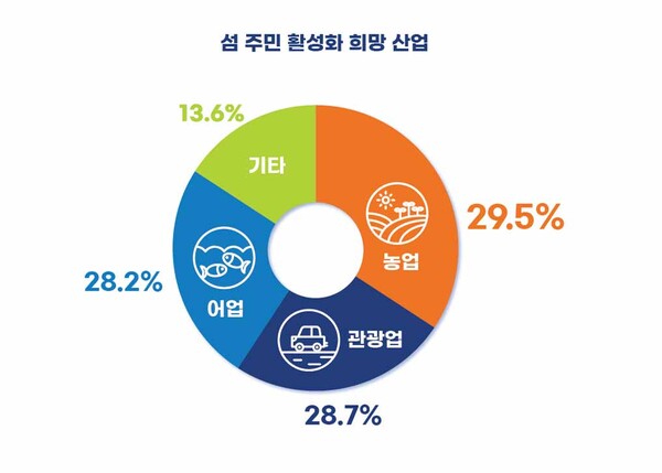 실제, 섬 주민에게 활성화 희망 산업을 물어본 결과, 전체 응답자의 29.5%가 ‘농업’이라고 답한 것으로 나타났다. 관광업(28.7%), 어업(28.2%)이 근소한 차이를 보였고 기타 산업에 대한 응답은 13.6%에 그쳤다.