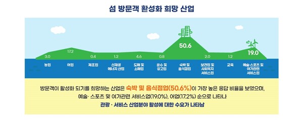 섬 방문객이 활성화되기를 희망하는 산업으로는 ‘관광업’이 가장 큰 비중을 차지했다. 유형별로는 ‘숙박 및 음식점업(50.6%)’, ‘예술, 스포츠 및 여가 관련 서비스업(19.0%)’, ‘어업(17.2%)’, ‘농업(3.0%)’ 순이다.