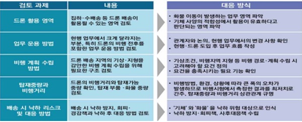 드론 배송 실증에는 먼저 검토 과제와 내용 및 대응 방식을 확정할 필요하다. 드론 배송에 필요한 기체 운용과 기능 요건 및 서비스 실용화를 위한 과제를 파악, 업무 내용을 사전 정의한 뒤 실제로 기체를 비행시켜 그 실현성과 효과를 검증한다. 실증시험 시 사전에 외부 환경에 미치는 영향과 필요 운용 시스템 등 검토 과제를 확정하고, 각각 과제에 대한 대응책을 마련함으로써 계량적으로 검증할 수 있는 환경을 조성한다.