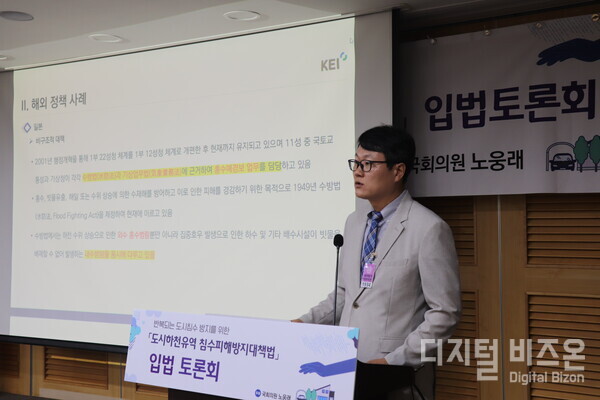 이승수 부연구위원은 이어 "이번 제정 법안에는 도시침수 저감대책에 하수 우수관로 용량 확대, 대심도터널 확보 빗물펌프장, 빗물저류조 저영향개발기법(LID), 펌프 및 저류조 운영방법개선, 침수위험지도, 침수예경보시스템, 침수대피장소 설치 등이 포함돼 있다”며 “우리보다 앞서 해외 국가들은 도시침수 정책을 각각 다르게 적용하고 있다”고 했다.