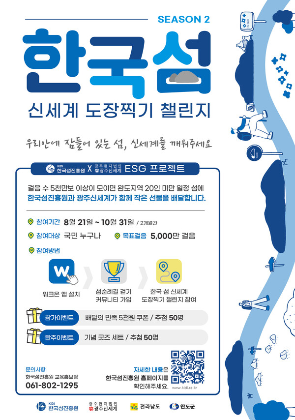 한국섬진흥원(KIDI, 원장 오동호)은 22일 광주신세계(대표이사 이동훈)와 국내 섬 관광 활성화 및 ESG 경영·사회공헌활동의 일환으로 ‘한국 섬 신세계 도장찍기 챌린지’ 시즌2를 시작한다고 밝혔다.