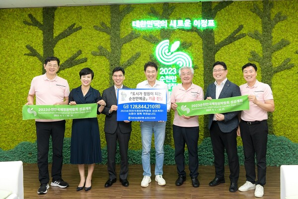 (재)순천만국제정원박람회조직위원회(이사장 노관규, 순천시장)는 24일, 순천만국제습지센터에서 NH농협은행이 1억 3천여만 원의 기부금을 전달했다고 밝혔다. 전달식에는 노관규 이사장(순천시장)과 조상명 순천시지부장 등이 참석했다.