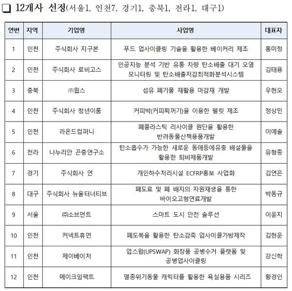 공단은 지난 7~8월 서류심사 및 발표심사를 통해 디지털 전환, 하수처리, 대기오염 저감, 업사이클링 등 환경 분야에서 사업성이 우수한 12개 기업을 최종 선정하였다.