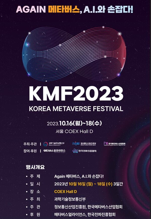 [디지털비즈온 이은광 기자] 한국메타버스산업협회는 ‘코리아 메타버스 페스티벌 2023(이하 KMF 2023)’을 10월 16일(월)~18(수) 3일간 서울 코엑스 D홀에서 개최한다고 8일 밝혔다.