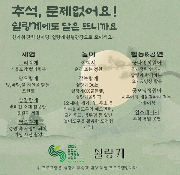 더불어 추석맞이 SNS 이벤트로 ▲온라인 룰렛 이벤트 ▲루미오와 뚱리엣을 찍어라를 진행, 현장을 직접 찾은 관람객은 물론이고 온라인상에서도 정원박람회에 참여할 수 있도록 했다. 자세한 사항은 순천만국제정원박람회 공식 SNS 채널을 참고하면 된다.