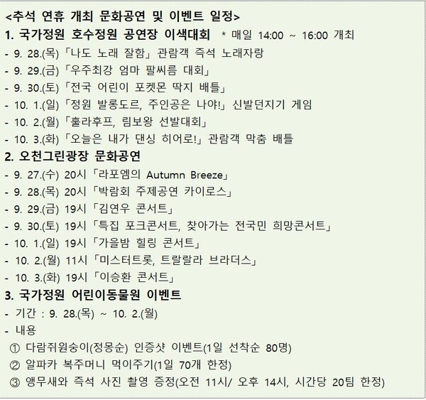 뿐만 아니라 국가정원 곳곳에서는 매직쇼, 저글링, 불쇼 등 상설공연도 함께 열려 추석 연휴 풍성한 볼거리를 선사한다.