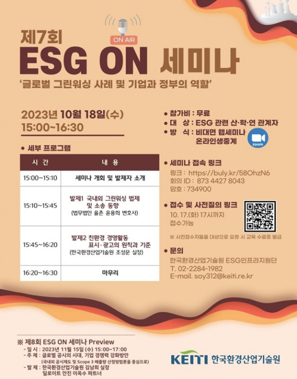 [디지털비즈온 이은광 기자] 한국환경산업기술원(원장 최흥진)은 오는 18일 친환경 위장 사례와 이에 대응하는 정부의 역할을 주제로 제7회 ‘ESG ON 세미나’를 개최한다.
