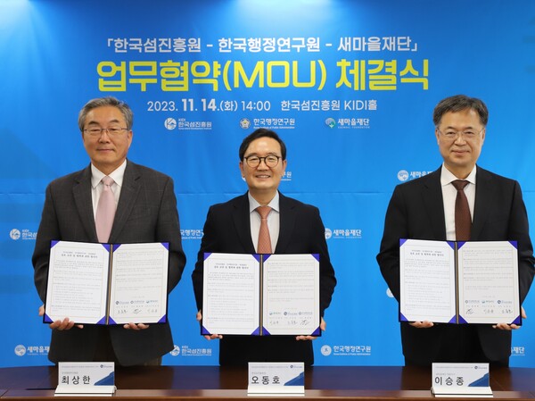 한국섬진흥원(KIDI, 원장 오동호)은 14일 목포 소재 진흥원에서 한국행정연구원(원장 최상한), 새마을재단(대표 이승종)과 업무협약을 체결했다고 밝혔다.