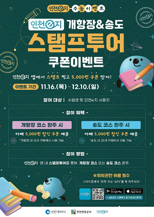 [디지털비즈온 이은광 기자] 인천광역시(시장 유정복)와 인천관광공사(사장 백현, 이하 공사)는 수능 수험생 격려 및 인천 관광 활성화를 위하여 11월 16일부터 12월 10일까지 MZ세대 맞춤형 ‘송도ㆍ개항장 모바일 스탬프투어’ 이벤트를 개최한다.