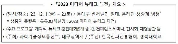 [디지털비즈온 이호 기자] 과학기술정보통신부(장관 이종호, 이하 ‘과기정통부’)는 국내 미디어‧콘텐츠 시장의 혁신적 신기술 동향 소개와 아이디어 발굴, 창업문화 확산을 위한 ‘2023 미디어 뉴테크 대전’을 12월 1일~2일 이틀간 동대구 벤처밸리 일대에서 개최한다.