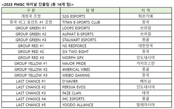 2023 PMGC 리그는 지난 11월 2일부터 11월 26일까지 말레이시아 쿠알라룸푸르에서 진행됐다. 먼저 그룹 스테이지를 통해 레드, 그린, 옐로 3개 그룹에서 각각 1위를 차지한 농심 레드포스(한국), 루프스 이스포츠(브라질), 메이저 프라이드(카자흐스탄)을 비롯해 상위 3개 팀씩 총 9개 팀이 2023 PMGC 그랜드 파이널로 직행했다.