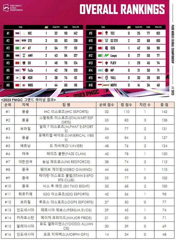 우승팀 IHC 이스포츠는 대회 1일차를 6위로 마감하며 우승과 거리가 멀어 보였다. 하지만 대회 2일차에 순위를 3위까지 끌어올리더니, 마지막 3일차에 뒷심을 발휘하며 총 142포인트로 사상 최초로 몽골의 PMGC 우승팀에 등극했다.