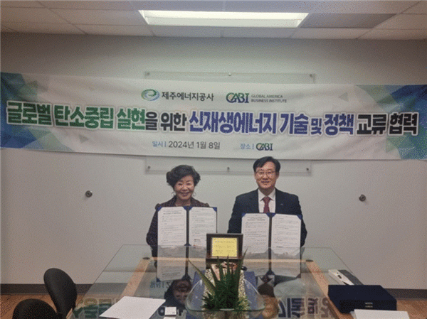 [디지털비즈온 류석균 기자] 제주에너지공사(사장 김호민)는 1월 8일(미국 현지 일자) 글로벌 에너지 전문 기관인 GABI(Global America Business Institute)와 글로벌 탄소중립 실현을 위한 신재생에너지 기술 및 정책 교류를 위한 업무협약을 체결했다.