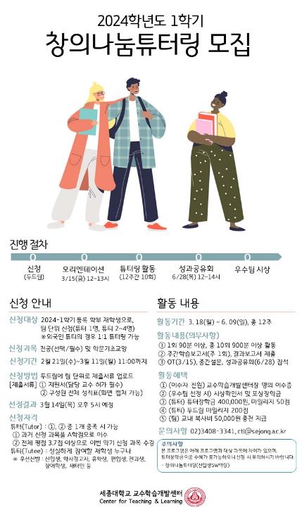 [디지털비즈온 이현주 기자] 세종대학교(총장 배덕효) 교수학습개발센터는 오늘 3월 11일까지 ‘2024학년도 창의나눔튜터링’ 참여자을 모집한다.