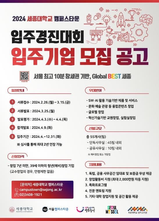 [디지털비즈온 이현주 기자] 세종대학교(총장 배덕효) 캠퍼스타운이 ‘2024 입주경진대회’ 입주기업을 모집한다.